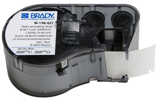 | Long Description | LABEL MAKER CARTRIDGE, SELF-LAMINATING, PERMANENT ACRYLIC ADHESIVE TYPE; B-427 VINYL MATERIAL; 1 INCH; 0.75 INCH; BMP21 PLUS PORTABLE LABEL PRINTER, IDPAL HANDHELD LABEL MAKER, LABPAL HANDHELD LABEL MAKER PRINTER TYPE; WHITE TAPE COLOR; BLACK PRINT COLOR |
