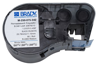 | Long Description | LABEL MAKER CARTRIDGE, HEAT SHRINK TYPE; B-342 POLYOLEFIN MATERIAL; WHITE COLOR; 0.75 INCH; 0.094 INCH MIN. WIRE DIAMETER; 0.215 INCH MAX. WIRE DIAMETER; 16 TO 8 AWG WIRE SIZE; 80 PER ROLL QUANTITY; BMP41, BMP51, BMP53 PRINTER TYPE; PERMASLEEVE[R] BRAND |
