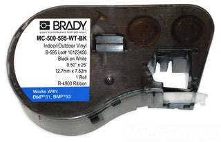| Long Description | LABEL MAKER CARTRIDGE, CONTINUOUS, LOW-SHRINK, PERMANENT ACRYLIC ADHESIVE TYPE; B-595 VINYL MATERIAL; 25 FOOT; 0.5 INCH; BBP 31, BMP51/53/71/21, GLOBALMARK, MINIMARK, POWERMARK, LABELIZER, VERSAPRINTER, IDXPERT, HANDIMARK, THERMAL TRANSFER PRINTER TYPE |