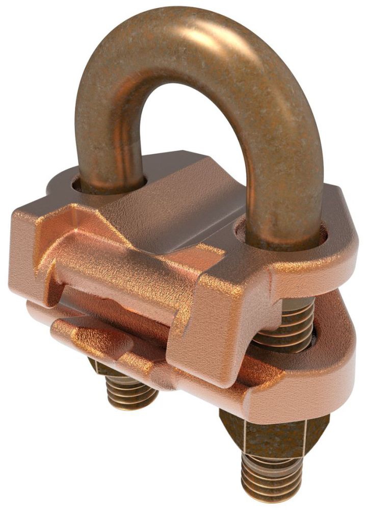 Long Description MECHANICAL GROUNDING CONNECTOR, BRIGHT DIPPED CAST HIGH COPPER ALLOY BODY, DURIUM SILICON BRONZE HARDWARE MATERIAL; 2-5/8 INCH W X 3-3/8 INCH H SIZE; PARALLEL/90 DEGREE COPPER CABLE TO PIPE/ROD, WIRE TO REBAR, FENCE POST, DIRECT BURIAL USED ON