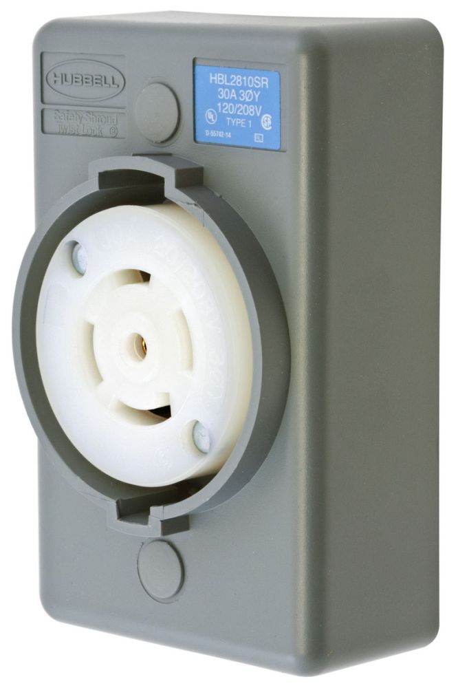 | Description Short | Locking Devices, Twist-Lock,Safety-Shroud Receptacle, 30A, 3 Phase Y 120/208V AC, 4 Pole, 5 Wire Grounding, NEMA L21-30R, RPT surface mounting, one gang, Gray |