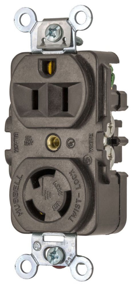 | Product Name | Twist-Lock, Industrial, Combo Face Duplex Receptacle, 15A 125V, 2-Pole 3-Wire Grounding, 5-15R and L5-15R, Screw Terminal, Brown, 2) Feeds 1) Return |