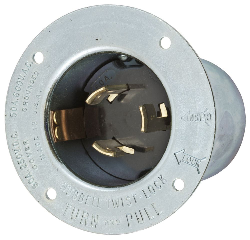 | Product Name | Locking Devices, Twist-Lock, Industrial, Flanged Inlet, 50A 250V/600V AC, Non-NEMA, Screw Terminal, Zinc plated steel casing, thermoset interior |