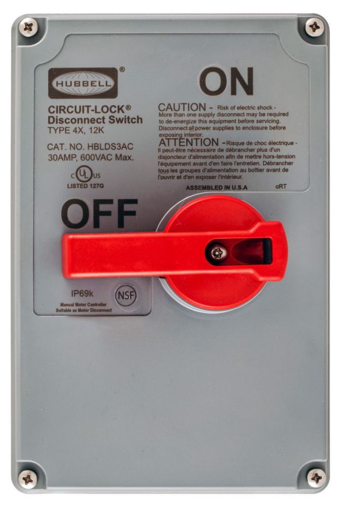 | Description Marketing Copy | NEC section 430.102(B) requires each motor controller to have a disconnect within line of sight from the motor and driven equipment. Hubbells Circuit-Lock Unfused Disconnect Switches are UL listed as a manual motor controller and also suitable as a motor disconnect and meet these code requirements. |